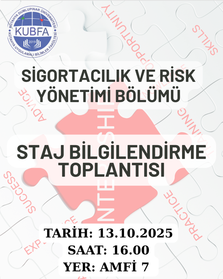 13 Ekim 2025 tarihinde, saat 16.00’da Amfi 7'de, Arş. Gör. Büşra Öztürk tarafından Sigortacılık ve Risk Yönetimi Bölümü öğrencilerine yönelik “Staj Bilgilendirme Toplantısı” gerçekleştirilecektir. Özellikle 2. ve 3. sınıf öğrencilerinin toplantıya katılması önemle rica olunur.
